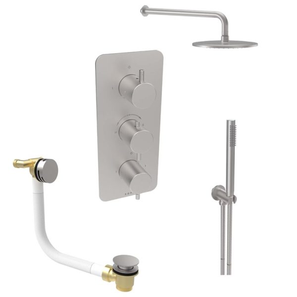 Saneux COS Brushed Nickel 3 Outlet Bath/Shower Package (COSP04.BN)Items included:COS 3-way thermostatic shower valve in brushed nickel / CO321.BNCOS slim round shower head in brushed nickel / CO223.BNCOS round wall-mounted shower arm in brushed nickel / CO229.BNCOS round slim handset in brushed nickel / CO230.BNCOS round shower outlet & holder in brushed nickel / CO234.BN1.5m shower hose in brushed nickel / SH150SS.BNCOS round bath filler, overflow and clicker waste in brushed nickel / CO101.BNWe also have a showroom in Wandsworth where you can see examples of the Saneux products!